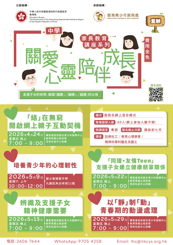教育局十分重視學生的健康成長,家長在支援學生的成長、培養積極的態度,以及促進全人發展方面均扮演重要角色。為持續提升家長對照顧子女精神健康的意識及能力,以及讓更多家長能掌握支援子女健康成長的知識和技巧,教育局已委託香港青少年服務處,在2026年3月至5月期間為小學及中學學生家長重辦「關愛心靈 陪伴成長」家長教育講座系列。學校一直積極推動家校合作和家長教育,現鼓勵家長積極參與講座,掌握促進子女精神健康的知識和技能。講座涵蓋有關子女精神健康的主題,包括支援子女建立健康的生活、處理衝突、明智使用數碼裝置、加強適應力和抗逆力、管理壓力、了解及照顧有精神健康需要的子女等。講座以面授及網上混合模式進行。有關「關愛心靈 陪伴成長」家長教育講座系列的詳情及報名方法,請按此(見附件):