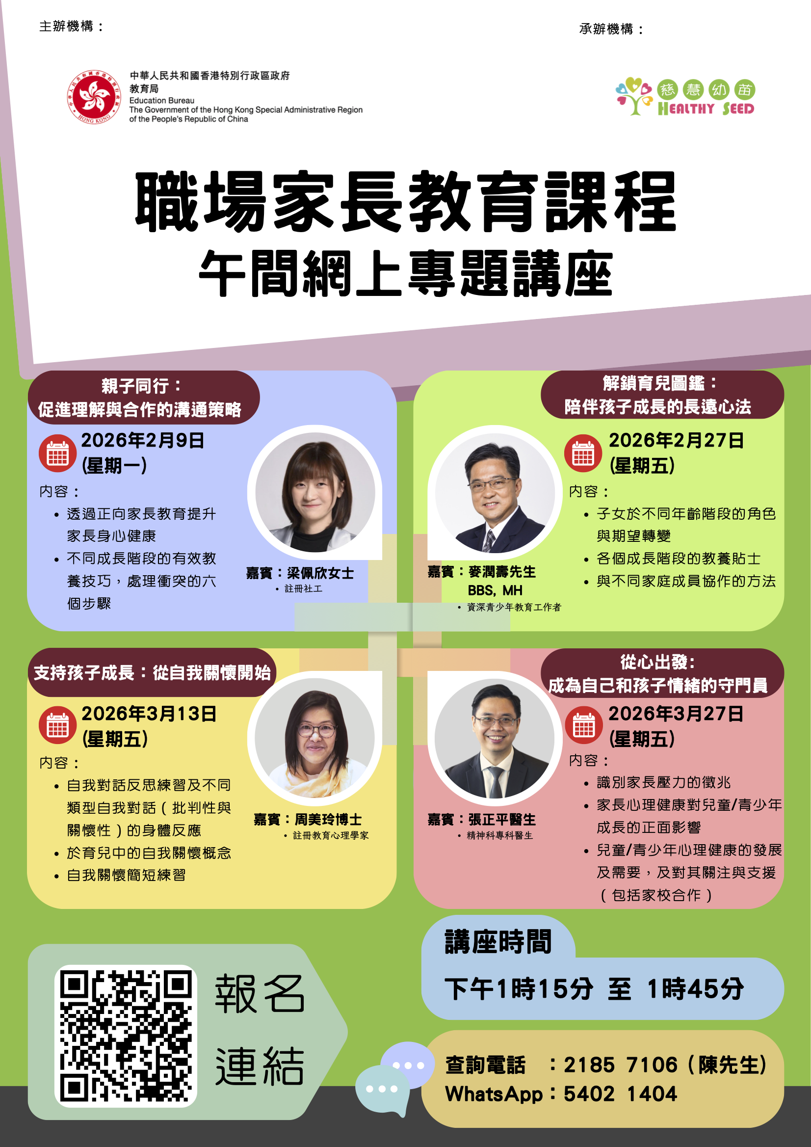 或掃描二維碼登記,所有申請將以先到先得形式處理,額滿即止。如有查詢,請致電3698 4376與教育局家校合作及家長教育組聯絡。