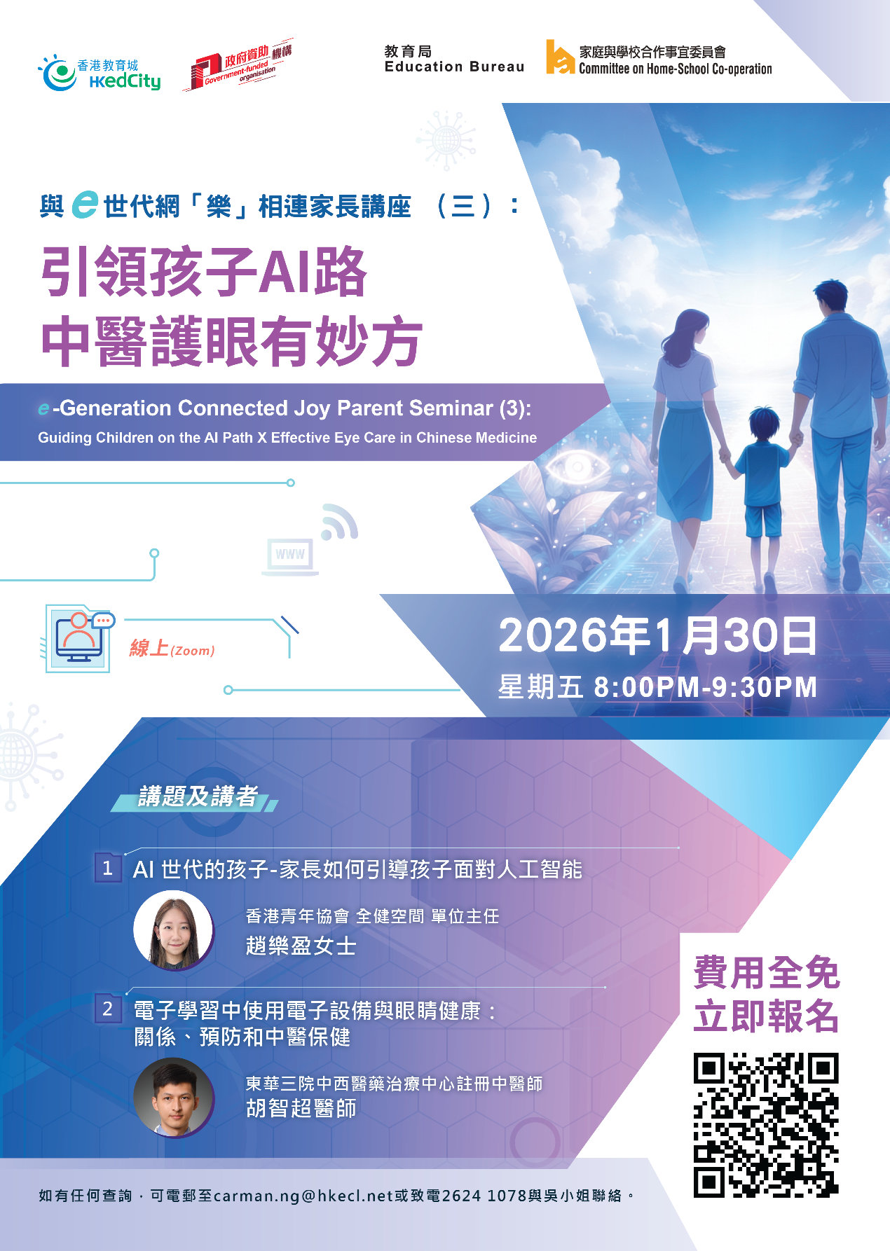 The Education Bureau, the Hong Kong Education City and the Committee on Home-School Co-operation, will co-organise the parent seminar “e-Generation Connected Joy Parent Seminar (3): Guiding Children on the AI Path Effective Eye Care in Chinese Medicine”. The seminar will be held on 30 Jan 2026 (Friday) from 8:00 pm to 9:30 pm in webinar mode. Registration is now open (application deadline: 30 Jan 2026 10:00 am). An unit in-charge of Wellness PLUS of the Hong Kong Federation of Youth Groups will analyse AI’s impact on learning, values, and psychological development for parents, using real-life examples to illustrate its risks and opportunities, and guiding parents on cultivating their children’s AI literacy. A Chinese medicine practitioner at the TWGHs Integrated Chinese and Western Medicine Treatment Centre will analyse the relationship between e-learning and eye health from both modern medical and traditional Chinese medicine perspective, and explain how to utilise Chinese medicine approaches to promote eye health. Parents are cordially invited to join the seminar. For details, please refer to the website (https://info.edcity.hk/en/event/11807).