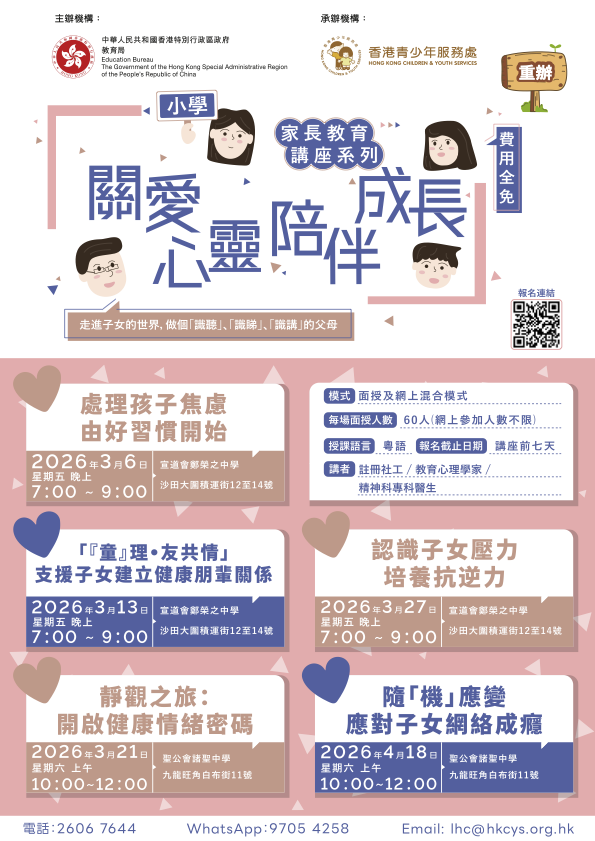 The Education Bureau (EDB) attaches great importance to students’ healthy development. Parents play an important role in supporting students’ growth, nurturing their positive attitude, as well as promoting their whole-person development. To continuously enhance parents’ awareness and ability of addressing children’s mental health, and assist more parents to acquire the knowledge and skills in supporting the healthy growth of their children, the EDB has commissioned the Hong Kong Children & Youth Services to re-run the “Caring for Their Heart and Soul, Growing along with Your Children” Parent Education Talk Series for parents of primary and secondary students between March and May 2026.